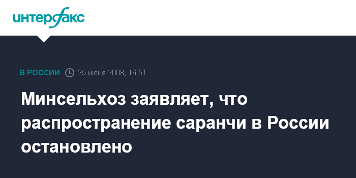 Выселки (Краснодарский край). 25 июня. INTERFAX.RU - Процесс активного распространения саранчи в РФ остановлен, заявил журналистам министр сельского хозяйства РФ Алексей Гордеев во время посещения фирмы "Агрокомплекс" в Краснодарском крае.