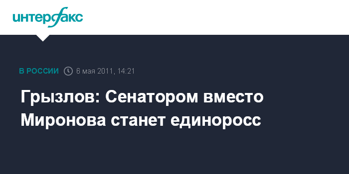 Москва. 6 мая. INTERFAX.RU - Место Сергея Миронова в качестве сенатора в Совете Федерации займет представитель "Единой России", заявил журналистам в пятницу председатель высшего совета партии спикер Госдумы Борис Грызлов.