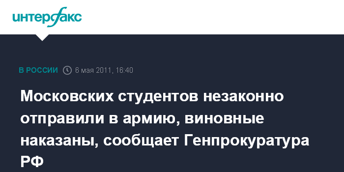 Москва. 6 мая. INTERFAX.RU - Московские чиновники, в том числе работники трех военкоматов, наказаны за незаконный призыв на военную службу в 2010 году 14 столичных студентов, сообщили в Генпрокуратуре РФ.