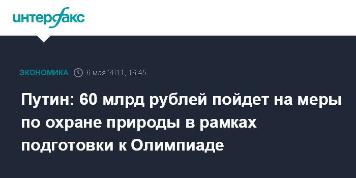 Волгоград. 6 мая. INTERFAX.RU - На природоохранные мероприятия в рамках подготовки к Олимпиаде будет потрачено 60 млрд руб., заявил премьер-министр РФ Владимир Путин.