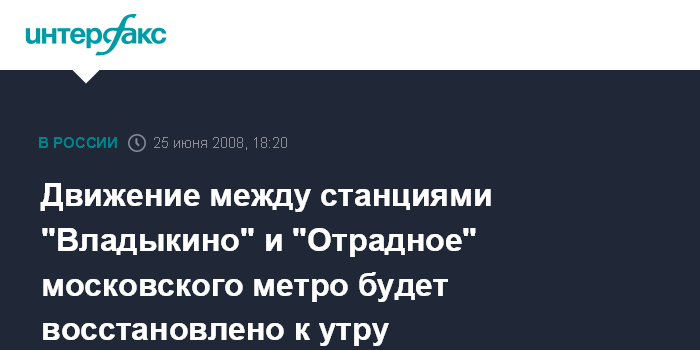 Москва. 25 июня. INTERFAX.RU - Специалисты московского метрополитена восстановят движение на участке между станциями "Владыкино" и "Отрадное" Серпуховско-Тимирязевской линии ("серой ветки") к утру 26 июня, сообщили "Интерфаксу" в пресс-службе метрополитена.