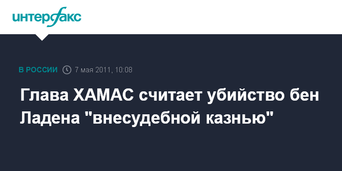 Лондон. 7 мая. INTERFAX.RU - Руководитель палестинской исламистской группировки ХАМАС Халед Мешааль осудил убийство лидера "Аль-Каиды" Усамы бен Ладена, сообщает британская телерадиовещательная корпорация Би-би-си. "Хотя мы осуждаем методы "Аль-Каиды", в особенности действия, направленные против мирных граждан, мы возражаем против того, чтобы Соединенные Штаты или еще кто-либо прибегал к внесудебным казням", - заявил лидер ХАМАС в специальном заявлении.