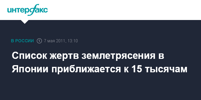 Токио. 7 мая. INTERFAX.RU - Национальное полицейское агентство Японии подтверждает гибель в результате разрушительного землетрясения и цунами 11 марта 14 тыс. 877 человек. За два дня список жертв пополнился именами 60 человек. Большая часть погибших отмечается в префектурах Мияги (8 тыс. 907 человек), Иватэ (4 тыс. 377 человек) и Фукусима (1 тыс. 529 человек).