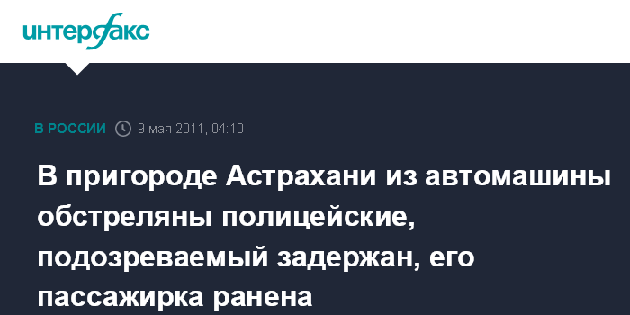 Ростов-на-Дону. 9 мая. ИНТЕРФАКС-ЮГ - По наряду полиции, проводившему оперативное мероприятие на окраине Астрахани, был открыт огонь из травматического оружия, стрельба велась из проезжавшей легковой автомашины, сообщили агентству "Интерфакс - Юг" в правоохранительных органах Астраханской области.