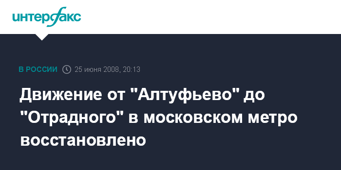 Москва. 25 июня. ИНТЕРФАКС-МОСКВА - Движение поездов на участке Серпуховско-Тимизязевской линии метро от станции "Алтуфьево" до станции "Отрадное" восстановлено, сообщил "Интерфаксу" в среду вечером руководитель пресс-службы столичного метрополитена Дмитрий Головин.