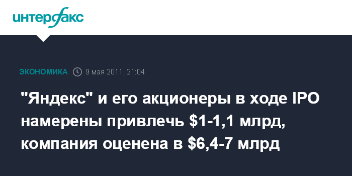 "Яндекс" и его акционеры в ходе IPO намерены привлечь $1-1,1 млрд, компания оценена в $6,4-7 млрд