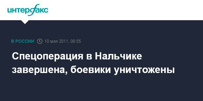 Нальчик. 10 мая. INTERFAX.RU - В Нальчике во вторник утром завершена спецоперация по нейтрализации боевиков, засевших в одном из жилых домов, сообщил "Интерфаксу" источник в правоохранительных органах