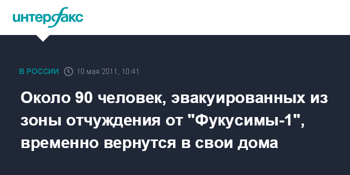 Токио. 10 мая. INTERFAX.RU - Около 90 жителей, эвакуированных из деревни Кавагути, расположенной в 20-километровой зоны отчуждения от АЭС "Фукусима-1", временно вернутся в свои дома, сообщают во вторник японские СМИ.