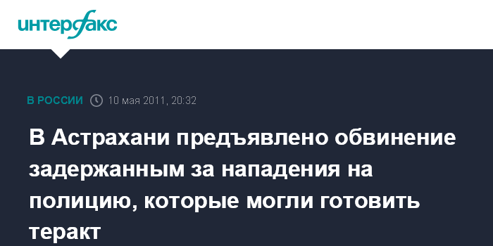 Астрахань.10 мая. INTERFAX.RU - Четверым членам группы, которая, по версии УФСБ Астраханской области, готовила теракты 9 мая, предъявлено обвинение по статье "покушение на жизнь сотрудников милиции" и "незаконное хранение оружия".