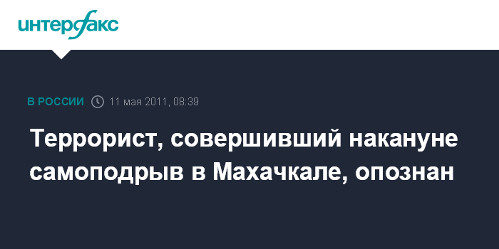 Махачкала. 11 мая. INTERFAX.RU - Личность террориста, совершившего самоподрыв во вторник в Махачкале, установлена, сообщили "Интерфаксу" в пресс-службе МВД Дагестана.