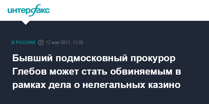 Москва. 12 мая. INTERFAX.RU - Следователи, как ожидается, предъявят обвинение экс-прокурору подмосковного Ногинска Владимиру Глебову по делу, связанному с незаконным игорным бизнесом в области.