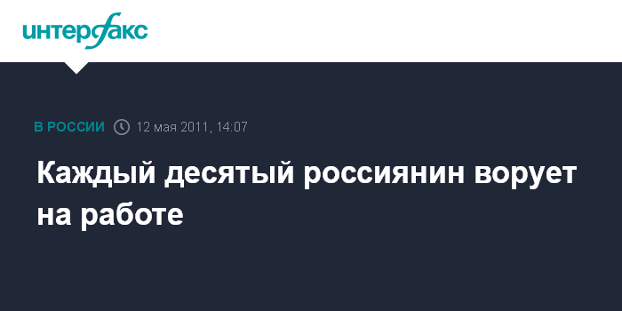 Москва. 12 мая. INTERFAX.RU - Почти каждый десятый россиянин регулярно крадет с работы канцелярские принадлежности, технику и деньги, свидетельствуют результаты опроса, проведенного порталом Joblist.ru в период с 2 по 8 мая среди 3000 работающих жителей страны. Еще 20% россиян крадут на работе иногда. Каждый третий респондент заявил, что сам на работе не крадет, но знает, что это делают его коллеги.