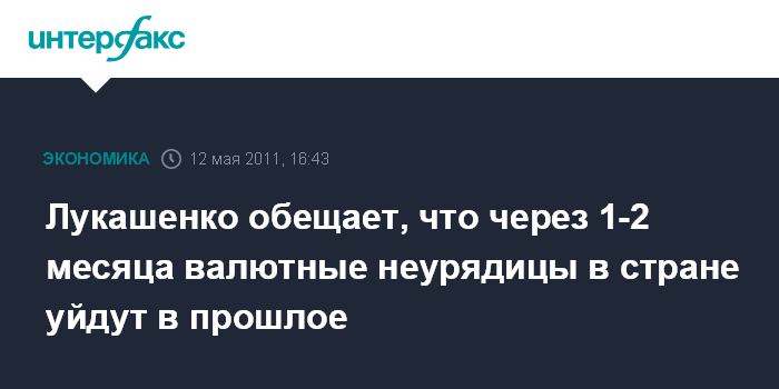 Минск. 12 мая. INTERFAX.RU - Президент Белоруссии Александр Лукашенко пообещал, что в Белоруссии через 1-2 месяца будет урегулирована ситуация на валютном рынке, сообщают белорусские государственные СМИ.