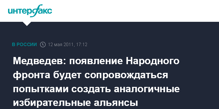 Москва. 12 мая. INTERFAX.RU - Президент России Дмитрий Медведев считает, что создание Общероссийского народного фронта "объяснимо с точки зрения избирательных технологий" и соответствует законодательству. При этом глава государства прогнозирует, что и другие партии захотят создать аналогичные альянсы.