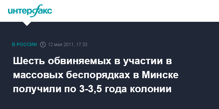 Минск. 11 мая. INTERFAX.RU - Суд Московского района Минска посчитал доказанной вину шестерых обвиняемых в участии в массовых беспорядках 19 декабря 2010 года и приговорил их к лишению свободы на срок от трех до 3,5 лет.