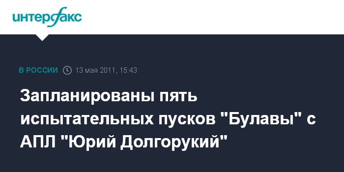 Москва. 13 мая. INTERFAX.RU - Программой создания нового стратегического ракетного комплекса морского базирования "Булава" предусматривается выполнение пяти испытательных пусков с атомной подводной лодки "Юрий Долгорукий", заявил на праздничном собрании, посвященном 65-летию Московского института теплотехники, генеральный директор института Сергей Никулин.