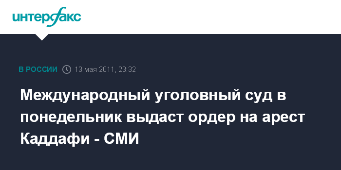 Лондон. 13 мая. ИНТЕРФАКС - Испанские СМИ в пятницу сообщили со ссылкой на источники в Международном уголовном суде Гааги, что суд в понедельник выдаст ордер на арест ливийского лидера Муаммара Каддафи, передает британская телерадиокорпорация Би-би-си.