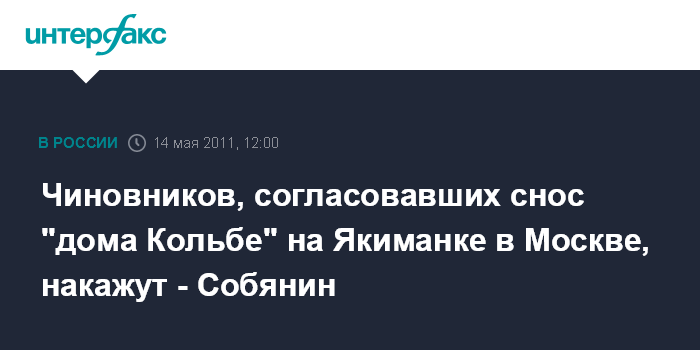Москва. 14 мая. INTERFAX.RU - В отношении чиновников, согласовавших снос старого здания на улице Якиманка в Москве, известного как дом Кольбе, будет возбуждено уголовное дело, заявил мэр Москвы Сергей Собянин. Столичный градоначальник назвал произошедшее с этим домом безобразным случаем.