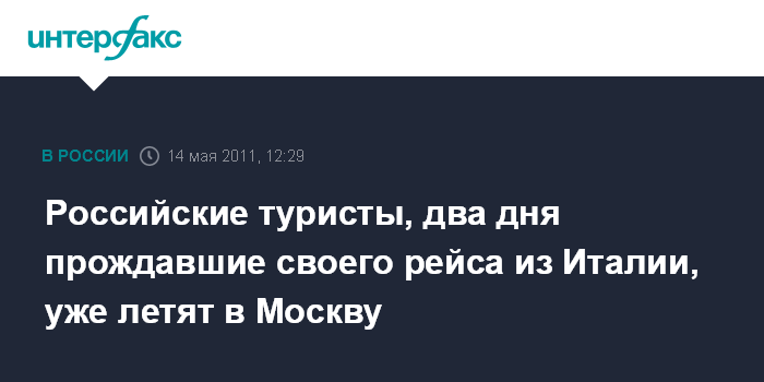 Москва. 14 мая. INTERFAX.RU - Российские туристы, которые застряли в итальянском городе Бергамо почти на двое суток, сейчас находятся в полете домой, сообщила агентству в субботу исполнительный директор Ассоциации туроператоров России Майя Ломидзе.