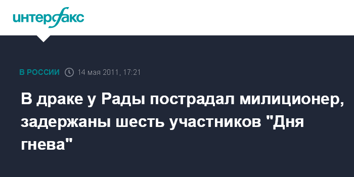 Киев. 14 мая. INTERFAX.RU - Сотрудники милиции в субботу задержали шестерых участников акции протеста "День Гнева" у здания Верховной Рады Украины, все они находятся в милицейском автобусе, сообщил агентству "Интерфакс-Украина" на месте событий начальник Центра общественных связей Главного управления МВД Украины в Киеве Владимир Полищук. По словам В.Полищука, в ходе инцидента пострадал один сотрудник милиции, кроме того, одной женщине, которая была участницей акции протеста, стало плохо, и ее забрала "скорая помощь".