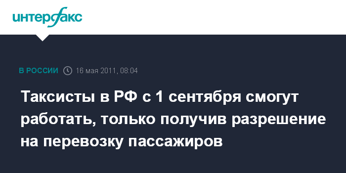 Москва. 16 мая. INTERFAX.RU - Российские таксисты обязаны получить к 1 сентября 2011 года разрешения на перевозку пассажиров и багажа, сообщил замглавы департамента обеспечения безопасности дорожного движения (ДОБДД) МВД РФ Владимир Кузин журналистам в воскресенье.