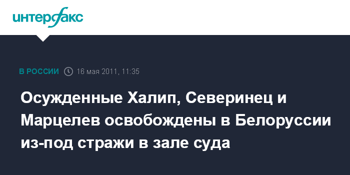 Минск. 16 мая. INTERFAX.RU - Суд Заводского района Минска принял решение об освобождении из-под стражи осужденных Ирины Халип, Павла Северинца и Сергея Марцелева.