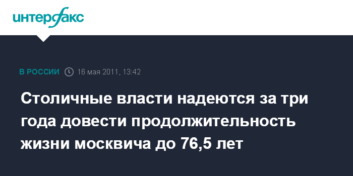 Москва. 16 мая. INTERFAX.RU - Московские власти рассчитывают в результате реализации программы развития городского здравоохранения увеличить среднюю продолжительность жизни в городе до 76,5 лет, заявила заместитель мэра Москвы по вопросам образования и здравоохранения Ольга Голодец.