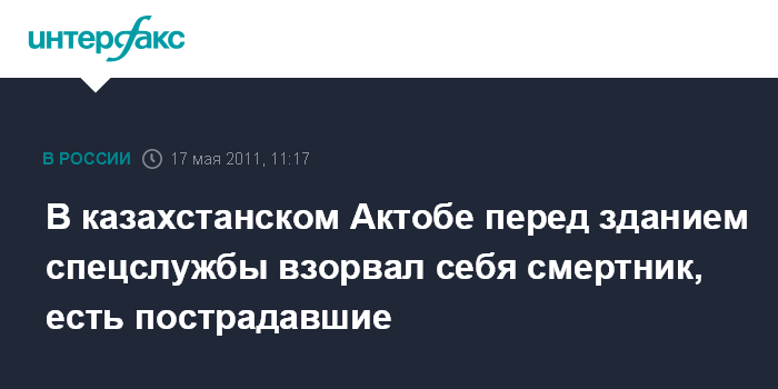 Астана. 17 мая. INTERFAX.RU - В центральной части казахстанского города Актобе перед зданием департамента комитета нацбезопасности (ДКНБ) совершен самоподрыв, есть пострадавшие, сообщили источники в правоохранительных органах.