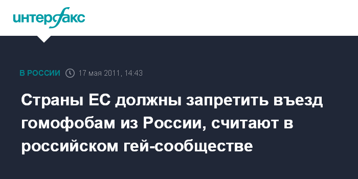Москва. 17 мая. INTERFAX.RU - Российское гей-сообщество намерено предложить властям различных стран запретить въезд на их территорию представителей РФ, которые, по мнению сексменьшинств, придерживаются гомофобских взглядов, сообщил лидер гей-движения Николай Алексеев.