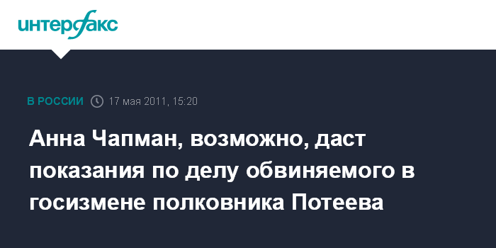Москва. 17 мая. INTERFAX.RU - Фигурантку прошлогоднего шпионского скандала, а теперь телеведущую Анну Чапман возможно вызовут свидетелем в суд по делу в отношении полковника Александра Потеева, заочно обвиненного в государственной измене, сообщил во вторник "Интерфаксу" источник, знакомый с ходом расследования.