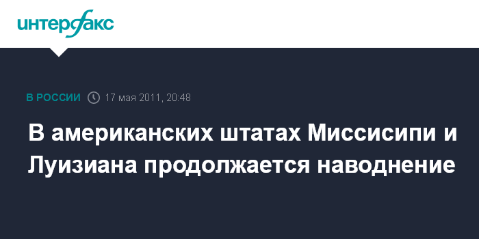 Вашингтон. 17 мая. INTERFAX.RU - Уровень воды может подняться к концу недели до рекордной отметки в городах Гринвилл, Натчез, Виксбург в американском штате Миссисипи, а также в Батон-Руже в Луизиане, сообщает во вторник американский телеканал CNN.