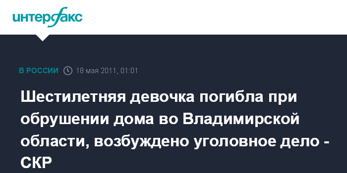 Москва. 18 мая. ИНТЕРФАКС - Уголовное дело по факту обрушения жилого дома возбуждено во Владимирской области, сообщает Следственный комитет России (СКР).