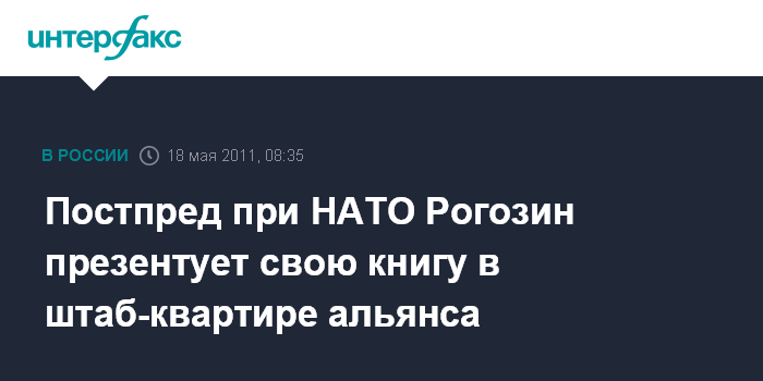 Брюссель. 18 мая. INTERFAX.RU - Постоянный представитель России в НАТО и глава Межведомственной рабочей группы при администрации президента РФ по взаимодействию с Североатлантическим альянсом по вопросам ПРО Дмитрий Рогозин в среду презентует свою книгу "Ястребы мира" в английском переводе в штаб-квартире НАТО в Брюсселе.