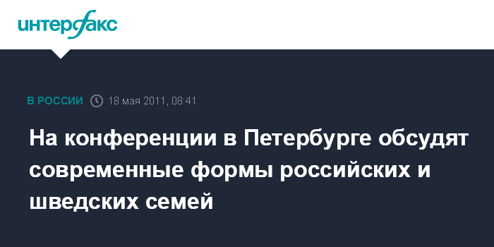 Санкт-Петербург. 18 мая. INTERFAX.RU - Международная научно-практическая конференция "Современные формы семьи в России и Швеции: тенденции и перспективы развития" откроется в Петербурге в среду, сообщили "Интерфаксу" в Северо-Западной академии государственной службы.