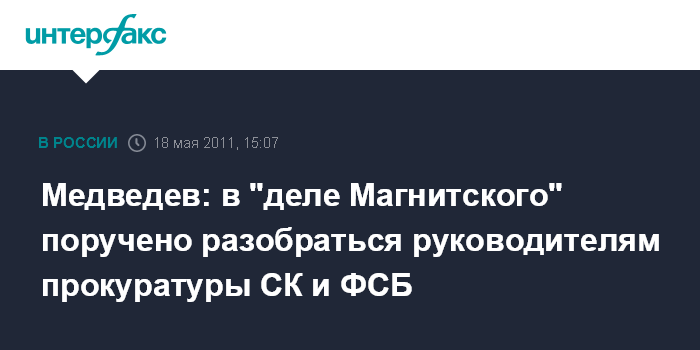 Сколково. 18 мая. INTERFAX.RU - Президент РФ Дмитрий Медведев заявил, что поручил руководителям силовых структур разобраться в деле о гибели сотрудника фонда Hermitage Capital Сергея Магнитского.