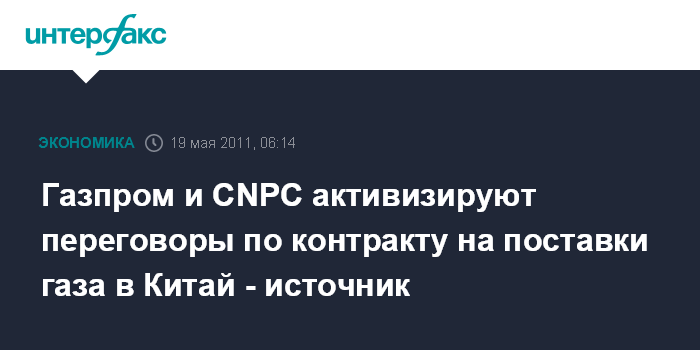 Пекин. 19 мая. ИНТЕРФАКС-КИТАЙ - ОАО "Газпром" и Китайская национальная нефтегазовая корпорация (КННК, CNPC) активизируют переговорный процесс, чтобы подписать контракт о поставках российского газа в Китай во время Санкт-Петербургского форума в июне 2011 года, сообщил агентству "Интерфакс-Китай" в четверг близкий к руководству CNPC информированный источник.