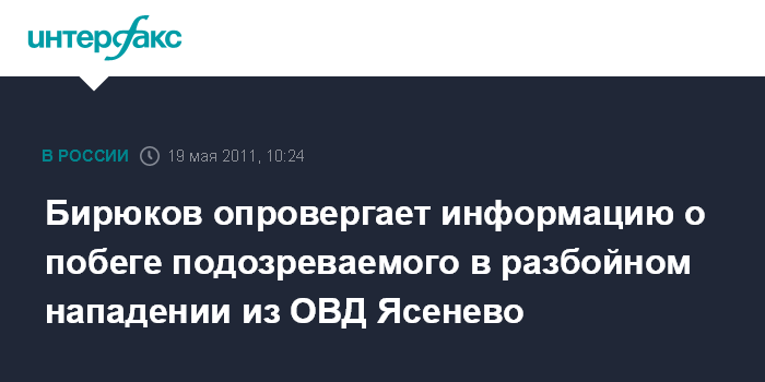 Москва. 19 мая. INTERFAX.RU - Официальный представитель Главного управления МВД РФ по Москве Виктор Бирюков опроверг информацию о побеге из-под стражи подозреваемого в разбойном нападении.