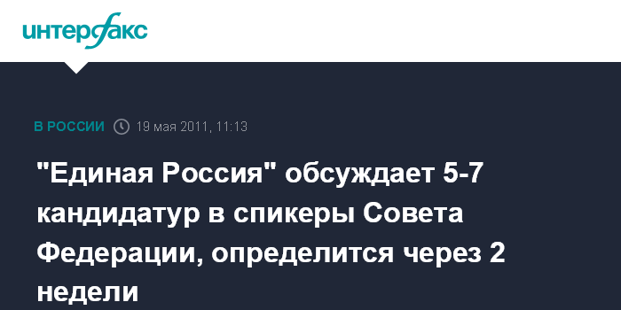 Москва. 19 мая. INTERFAX.RU - В течение двух недель руководство "Единой России" намерено определиться по поводу возможного кандидата на пост спикера Совета Федерации и сенатора от Заксобрания Санкт-Петербурга, сообщил председатель Высшего совета "Единой России", спикер Госдумы Борис Грызлов.