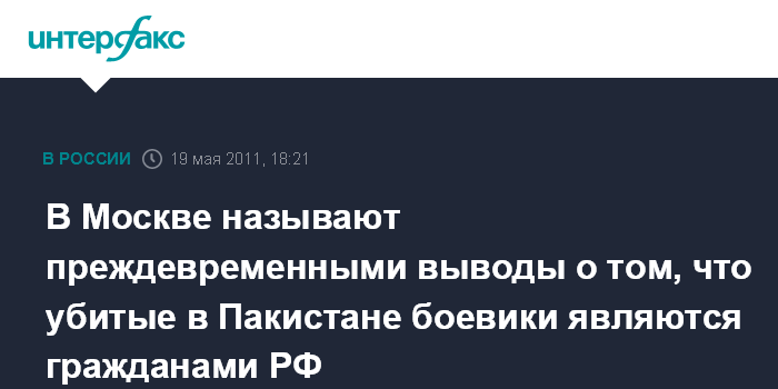 Москва. 19 мая. INTERFAX.RU - МИД России пока не подтверждает, что в Пакистане в ходе спецоперации местных властей уничтожены пять боевиков с российскими паспортами