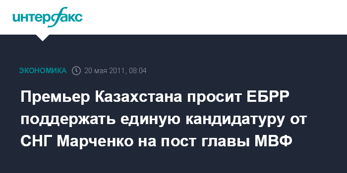 "Премьер министр России и премьер-министры других стран СНГ согласились поддержать кандидатуру главы Нацбанка Казахстана на пост главы МВФ. Я призываю вас также оказать нам поддержку в избрании господина Марченко управляющим директором МВФ", - сказал он в пятницу в Астане, выступая на экономическом форуме ЕБРР.