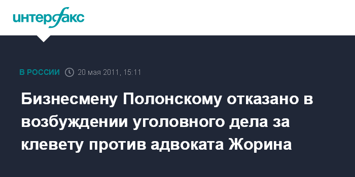Москва.20 мая. INTERFAX.RU - Правоохранительные органы отказали в возбуждении уголовного дела против адвоката Сергея Жорина по заявлению бизнесмена Сергея Полонского о клевете.