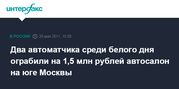 Москва. 20 мая. INTERFAX.RU - В Москве в пятницу на Балаклавском проспекте совершено вооруженное нападение на автосалон "Консул-авто".