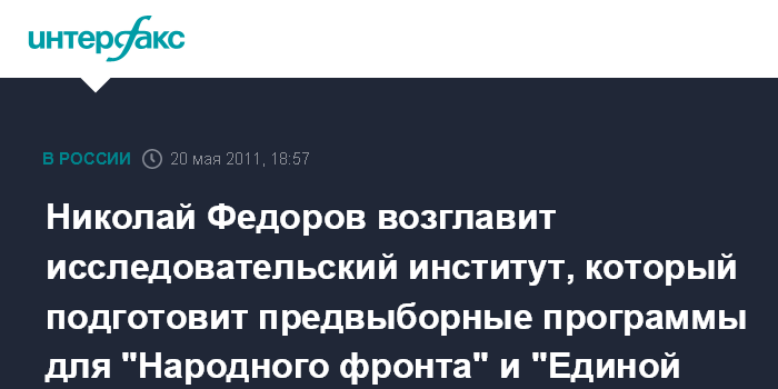 Москва. 20 мая. INTERFAX.RU - Премьер-министр РФ Владимир Путин поручил Николаю Федорову возглавить Институт социально-экономических и политических исследований, который займется подготовкой предвыборной программы для "Народного фронта" и "Единой России".