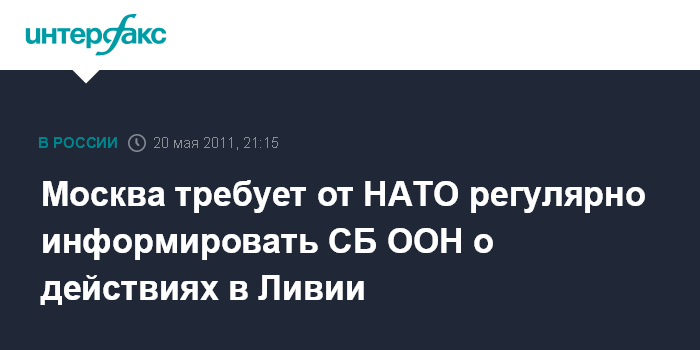 Москва. 20 мая. INTERFAX.RU - МИД РФ заявил, что подлинные цели действий коалиции НАТО в Ливии вызывают серьезные сомнения, и потребовал регулярного информирования Совета Безопасности ООН о всех действиях коалиции.