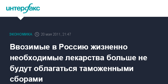 Москва. 20 мая. INTERFAX.RU - Правительство России освободило от уплаты сборов за таможенные операции при ввозе в РФ незарегистрированных лекарств для оказания медицинской помощи по жизненным показаниям конкретного пациента, а также гемопоэтических стволовых клеток, костного мозга.