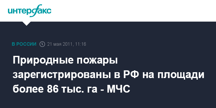 Москва. 21 мая. INTERFAX.RU - Площадь природных пожаров в России за сутки увеличилась почти на треть, сообщает МЧС РФ. По данным на утро субботы, зарегистрировано 187 очагов природных пожаров на общей площади 86 014 га, в том числе 16 крупных пожаров на территории Республики Саха (Якутия) на площади 41 015 га. Значительные территории охвачены природными пожарами и в Дальневосточном федеральном округе.