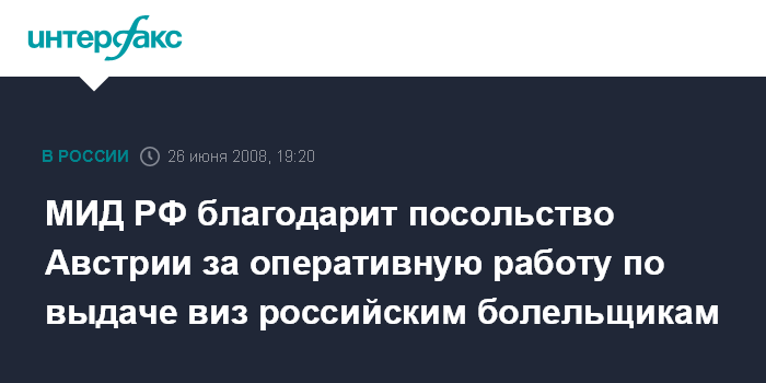 Москва. 26 июня. ИНТЕРФАКС - МИД РФ дал высокую оценку работе консульского отдела посольства Австрии в Москве, за три последних дня выдавшего около полутора тысяч виз российским болельщикам, которые пожелали отправиться в Вену на полуфинальный матч Евро-2008 между Россией и Испанией.