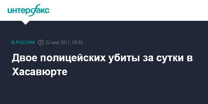 Накануне, в 12 часов 25 минут в Хасавюрте на улице Тотурбиева неизвестный двумя выстрелами из пистолета причинил смертельное огнестрельное ранение в живот находившемуся на службе инспектору ДПС ОГИБДД ОВД по городу и скрылся, сообщил "Интерфаксу" источник в правоохранительных органах. С места происшествия изъяты две гильзы калибра 9 мм. Возбуждено уголовное дело по ст. ст. 317 и 222 УК РФ.