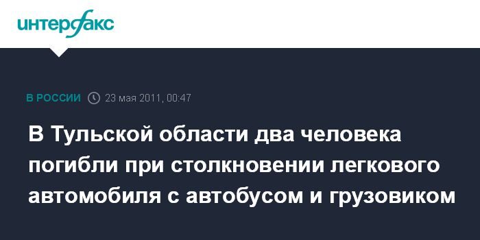 Тула. 23 мая. ИНТЕРФАКС-ЦЕНТР - В Тульской области произошло столкновение пассажирского автобуса, грузовой машины и "ВАЗ-2010", в результате погибли два человека, еще восемь человек получили травмы.
