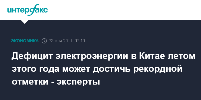 Пекин. 23 мая. ИНТЕРФАКС-КИТАЙ - В наиболее активный - летний - период потребления электроэнергии в текущем году в Китае ожидается рекордный уровень дефицита электричества, сообщила в понедельник газета "Цзинцзи цанькао бао".
